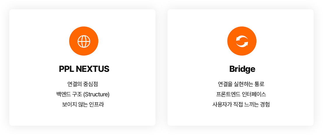 두 개의 점은 PPL Networks(브랜드)와 PPL TNC(사람)를 의미하며, 이 둘을 연결하는 아치가 바로 K브릿지의 역할임을 직관적으로 보여줍니다.