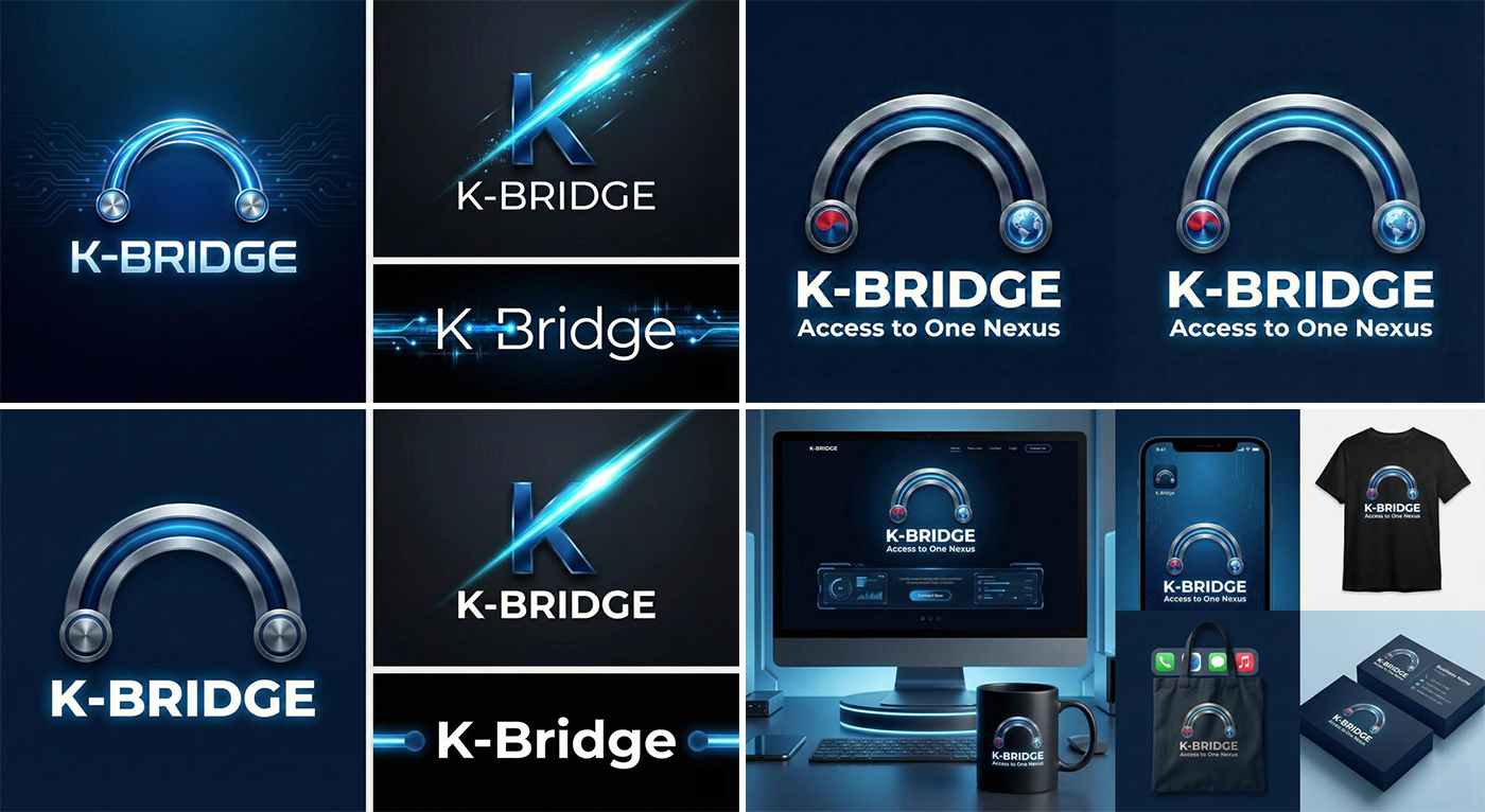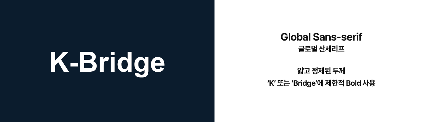 심볼 하단에 간결하고 세련된 글로벌산세리프서체로 K-Bridge를 배치합니다. ‘K’와 ‘Bridge’의 두께를 동일하게 유지하여 하나의 통합된 시스템임을 강조합니다.